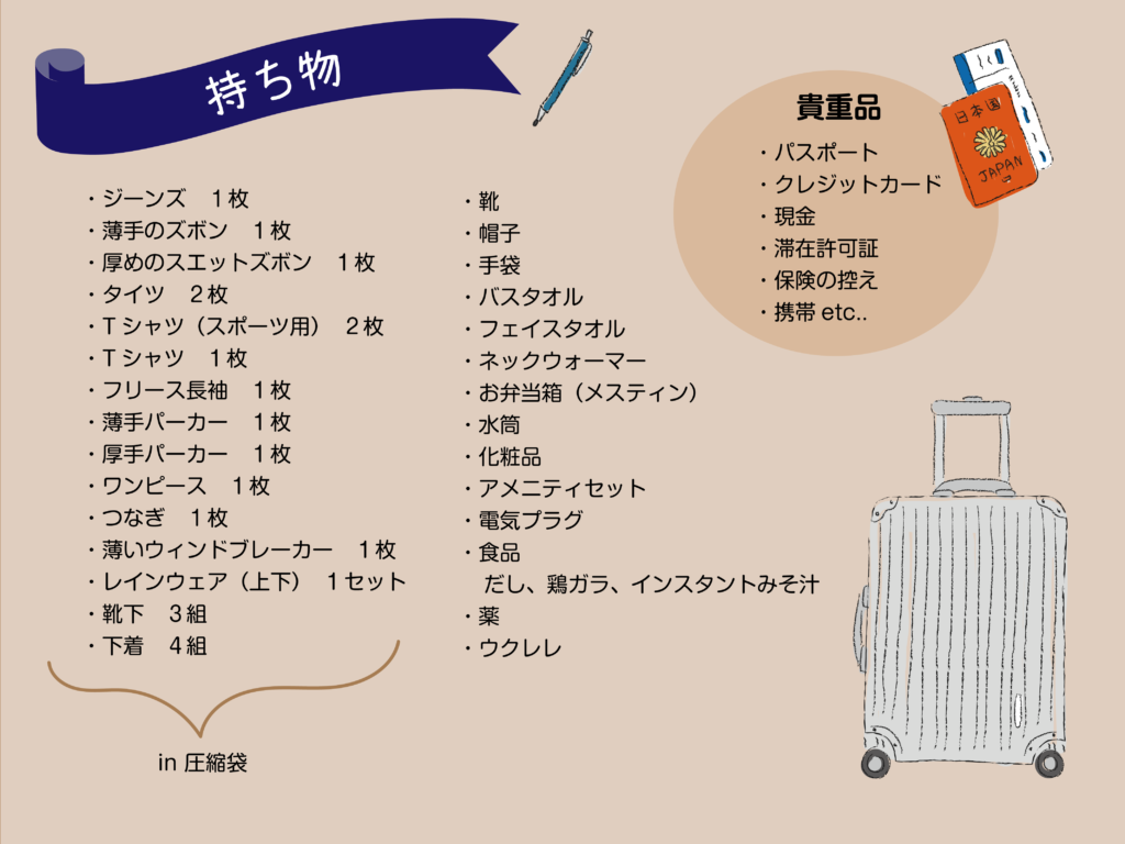 ノルウェーに持っていったものを書き出してみました。思い出しながら書いているので、忘れているものもあると思いますが、大体こんな感じです。