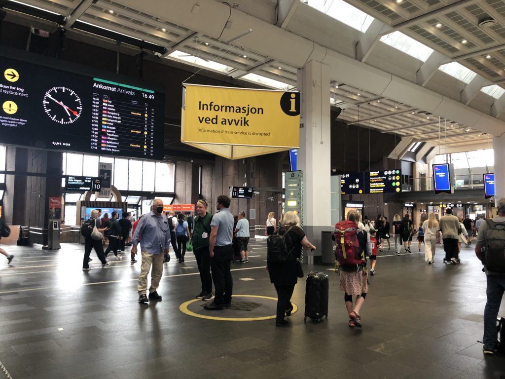 この写真は、オスロ駅の案内所の写真なのですが、円の中に立っているのは職員です。当然、マスクはしていません。さて、一人だけマスクをしている方がいらっしゃいます。どこにいるでしょうか?